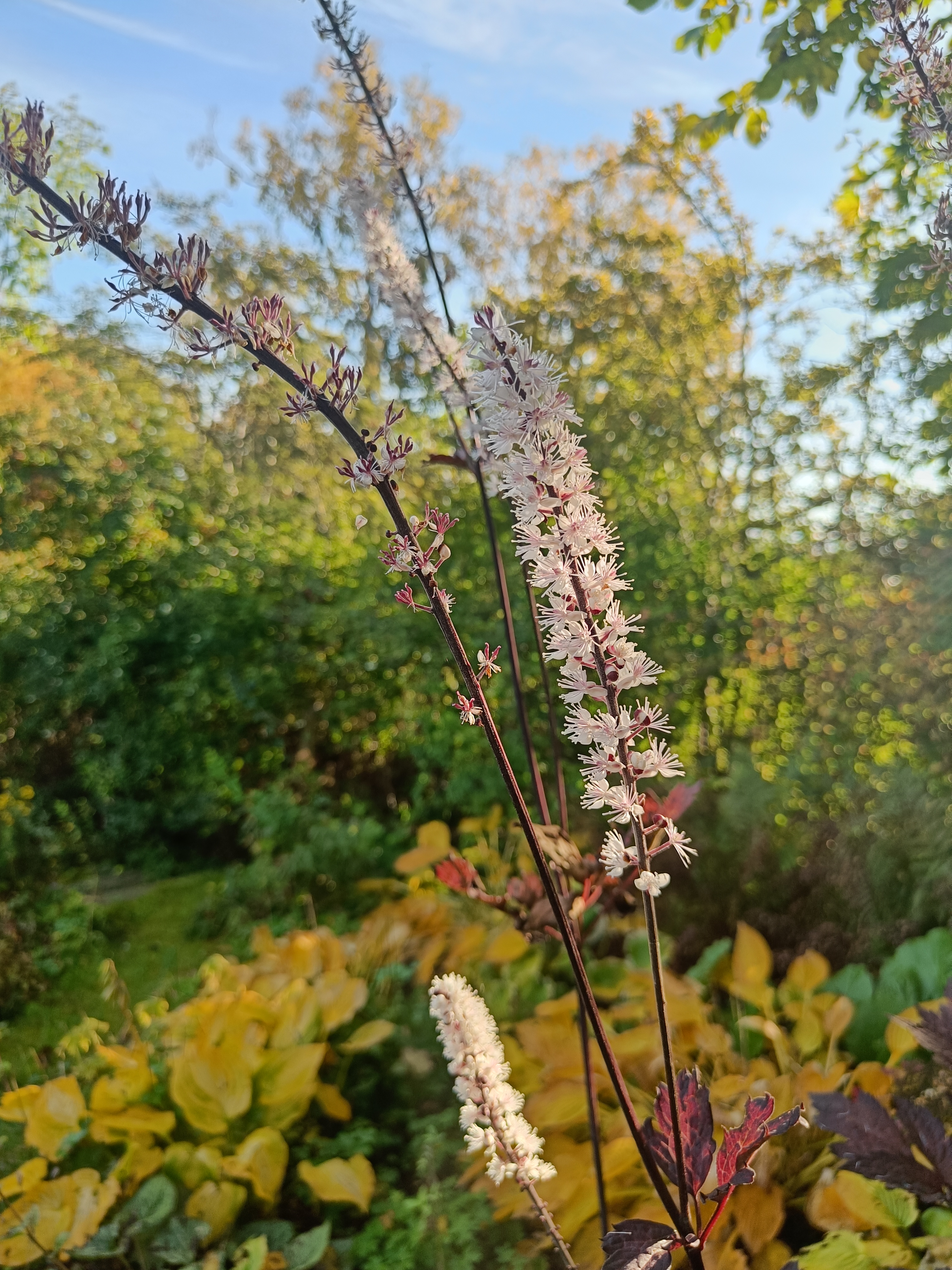 Den yngste av søstrene Høst har i lengre tid ruslet barføtt gjennom hagen og etterlatt striper av gult og rødt der hennes hender har strøket over plantene. De fleste av hagens blomster har bøyd sine hoder for henne og latt sine kronblader falle til jorda. En og annen rose på nesten bare kvister strekker seg fremdeles mot himmelen, og den sentblomstrende Ormedrua (Cimifuga ramosa) har lysende hvite spir på mørkerøde flikete blader. De forskjellige syrinhortensiaene (hydrangea paniculata) er ennå vakre der de står i full blomst, som de allerede har gjort i mange uker, men noen har fått en kledelig rødme i kronbladene etter Lillesøster Høsts besøk. Om ikke så altfor lenge vil Lillesøster Høst måtte vike plassen for Storesøster Høst, og også de sentblomstrende hagebeboerne vil måtte knele for henne. Det gjelder å nyte det hele mens man kan!