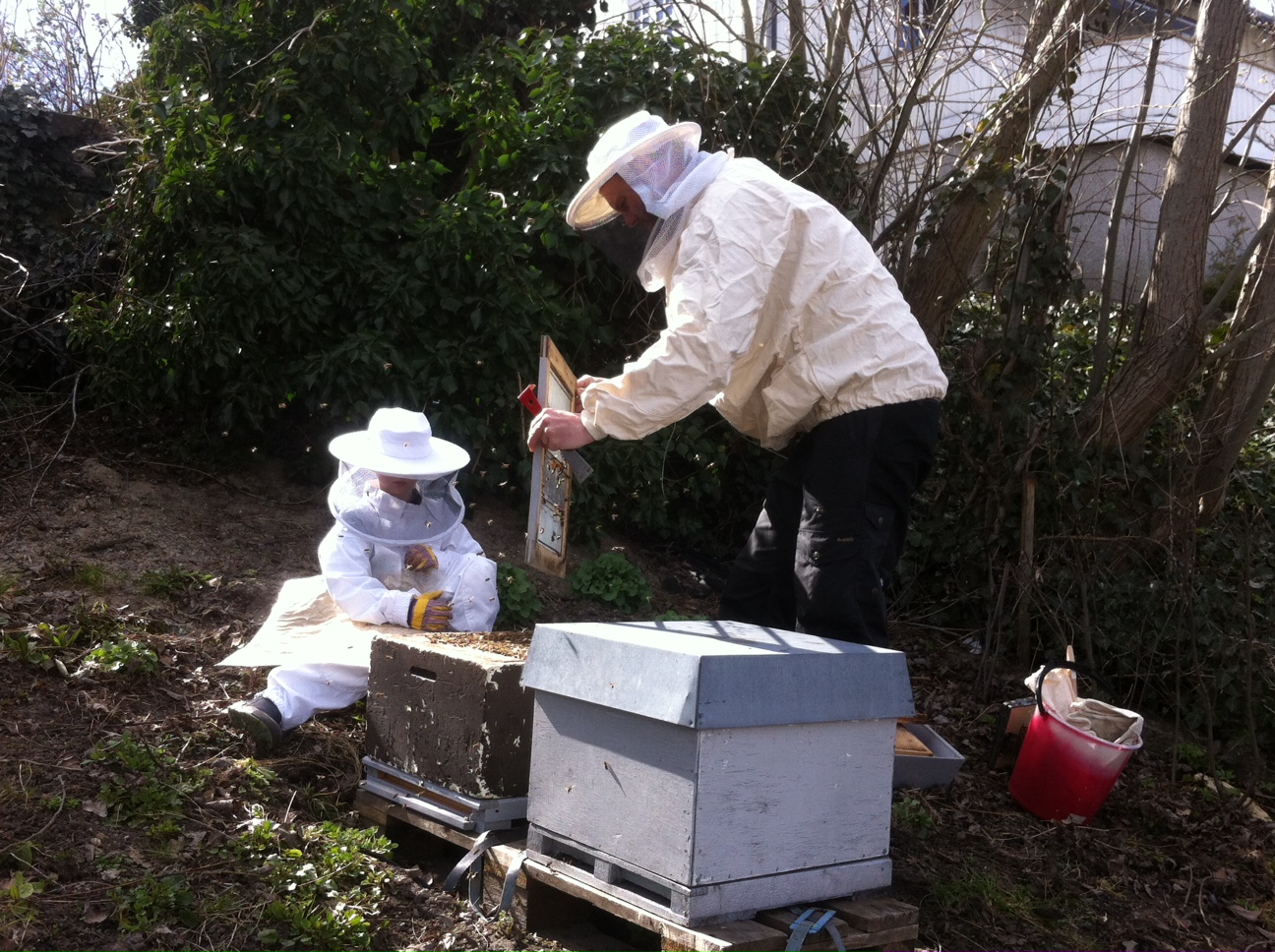 Vi ble derfor alle sammen invitert ned i Nedre Hage av husets birøktere for å se på livet i kubene der; nå skulle vårrengjøringa foretas. Jeg trodde vi bare skulle se på kubene og så gå, så jeg takket pent nei til lån av drakt. De små skulle bytte på den ene drakta vi har for barn. Da vi kom ned og birøkteren begynte å løfte på lokk og ordne og fikse slik birøktere gjør, skjønte jeg at uten drakt var dette ikke noe for meg. Jeg forsvant derfor litt lenger ned i hagen og lukte fram bringebærbuskene som ble overmannet av naboens geitrams i fjor. De små lot ikke til å bry seg nevneverdig om at det surrer rundt dem og at de fikk bier som satte seg på hendene deres (med hansker!). Da det til og med var mulig å se klekkingen av en ny bie, fikk den øyeblikkelig navn, og alle hjerter gledet seg.