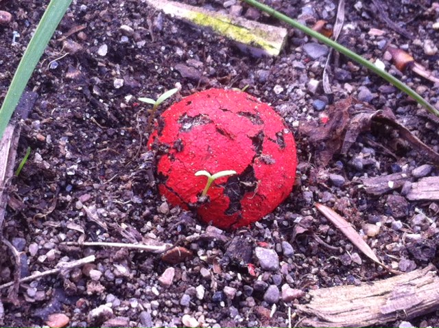 Nå eksploderer frøbombene! Riktignok ikke helt som jeg hadde forestilt meg (og heller ikke slik som lovet på pakka), men det er kommet to fine grønne spirer. Jeg må innrømme at mor gleder seg mer over gavene enn barna gjør, men det kan jeg leve med! De synes nok det blir morsomt når bedene deres også rødmer!