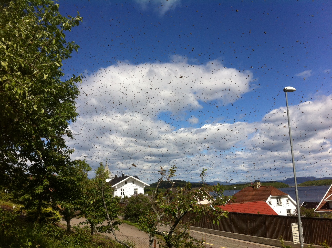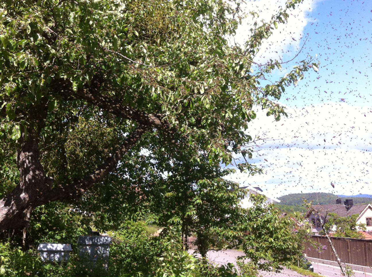 Minstemann og jeg var i dag i Nedre Hage for å klippe gresset i gressgangen der nede. Det var sol og deilig vær, litt vind, men ennå ikke så ille. Med ett var hele lufta rundt bikubene, og oss!, full av bier. Det er vanligvis en del liv der, men nå var det virkelig vilt! Det tok litt tid før det gikk opp for meg at de nå foretok den fryktede svermingen. Nei, de stikker av!