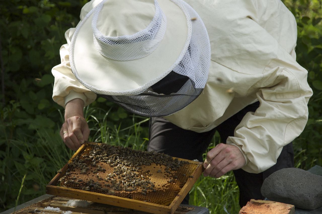 Det summer ikke bare av humler hos oss; også biene er i full sving. Stort sett er de veldig fredelige, og jeg har ennå til gode å få bistikk. Husets birøker har fått opptil flere, men så stikker også han hendene sine ned i kubene, så hva kan man forvente?! Jeg har i alle fall observert at det er godt med frukt både på epletreet og på morelltreet i år, så det er neppe noen ulempe å ha bier i hagen sin. Og så blir det masse deilig honning ut av det! Mmmmmm.