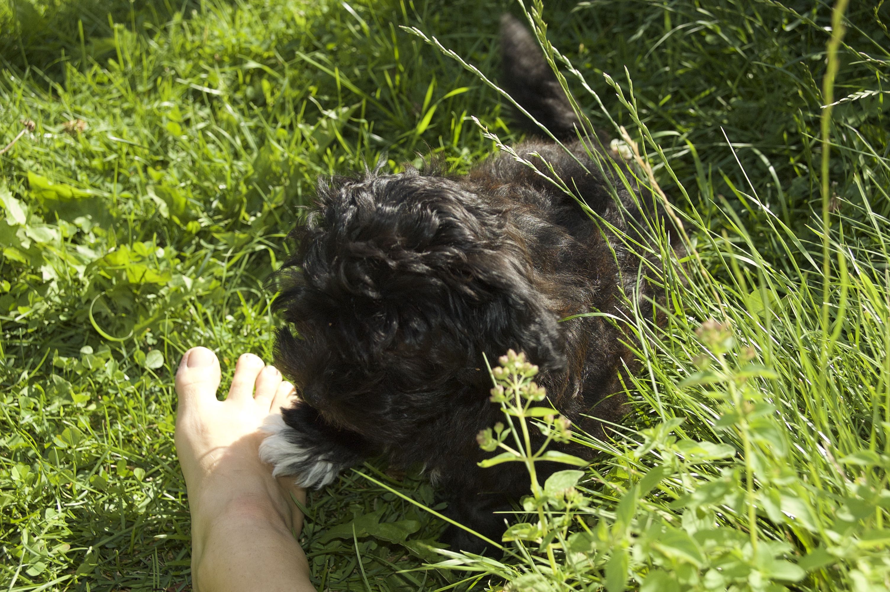hjerteknuser. Ungene elsker ham, og han er tillitsfull og både kjælen og leken. Det var litt krise et øyeblikk da han beit høl i Ada Sofies favorittkjole, men ellers har det stort sett vært meg og mine ting han har knagd på (tøflene mine får jeg sikkert ikke tilbake før etter jul).
