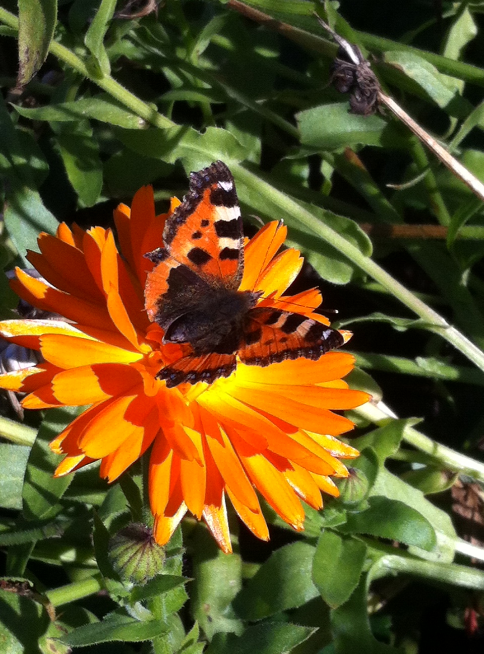 Det er nå allerede blitt oktober, og hagen går langsomt til ro. Det er ennå noen få fargeklatter her og der i bedene, men det er lenge siden hagen var et flott syn. De selvsådde ringblomstene lyser riktignok fremdeles opp nede i grønnsakshagen, og jeg klarer ikke å la være å smile når de skinner om kapp med høstsola. En sliten og fillete neslesommerfugl svinger seg lett mellom blomstene og lurer nok på hvor sommeren ble av. Mon tro om den sjekker inn på insektshotellet vårt i vinter?