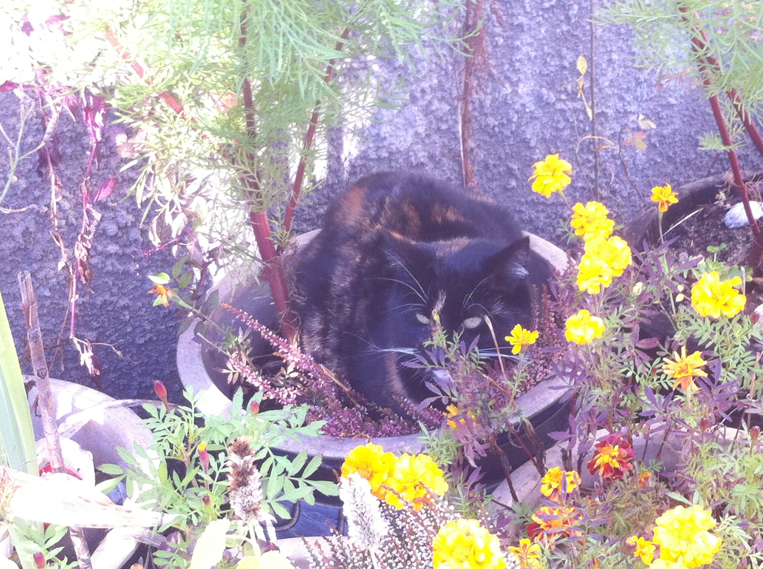 Siden bakken er våt og kald, finner ho seg heller et varmt og mykt sted med god oversikt over hvem som kommer og går; hagepotta med cosmo og høstlyng foran inngangsdøra. Her har ho allerede klemt lyngen helt flat – uten at det ser ut til at ho bryr seg nevneverdig om det. Bak den fremdeles blomstrende tagetesen har ho dessuten klart å gjemme seg for Bulder som ellers er et relativt stort forstyrrelsesmoment i hverdagen. Her ligger ho godt fornøyd over livet og maler slik bare enfornøyd pus kan. I mitt neste liv skal jeg bli en katt!