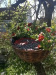 Jeg gjentok prosedyren for en kurv til. Den fylte jeg med jord og plantet to petuniaer oppi som husets tenåring var med på å plukke ut (det er flere nerder i familien, så Harry potter-nerden ville naturligvis ha petunia!). Her brukte jeg et vindskjev skjenebrett som jeg fylte med frø. Jeg har egentlig tenkt å fylle dette med vann, slik at det blir vann i én kurv og mat i den andre, men først ville jeg se om fuglene i det hele tatt reagerte. Nå henger begge kurvene i treet og kommer til å være til forlystelse for både de med vinger og de uten. En idé for flere, kanskje?