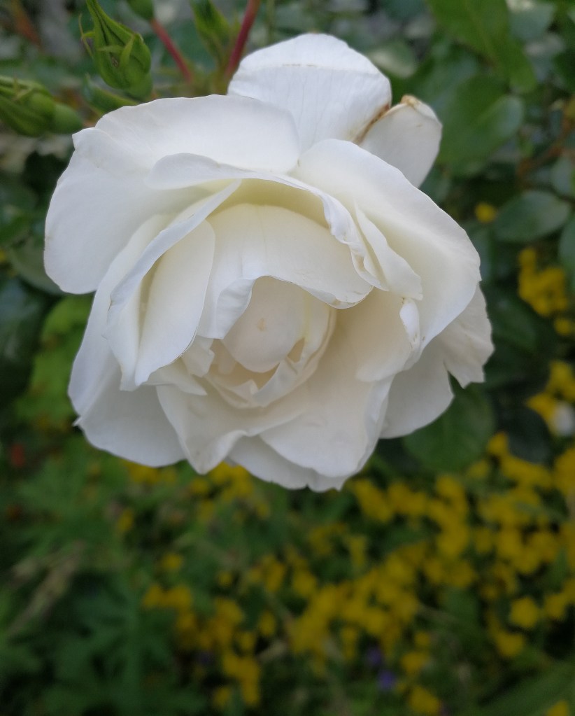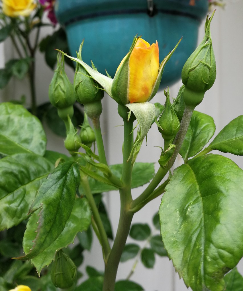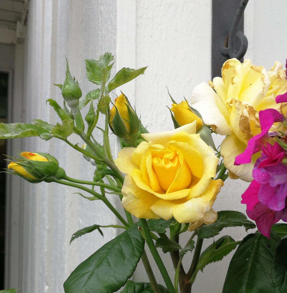 For et par år siden bestemte jeg meg for å plante ei rose øverst i Solbedet i Mellomhagen. Helt motsatt av hva navnet på bedet sier, så er denne delen av bedet ganske skyggefullt grunnet en levegg. Jeg trengte derfor ei rose som tålte skygge greit. På det lokale gartneriet (anbefaler alle som er i nærheten av Horten å dra innom Vegge gård og gartneri) fikk jeg anbefalt den gulblomstrete buskrosa Chinatown. Jeg kjøpte rosa, men jeg skulle likevel ombestemme meg hva plantested angår, så nå står buskrosa i ei stor potte ved inngangsdøra i stedet for (mens en kristtorn står der rosa egentlig var tiltenkt).