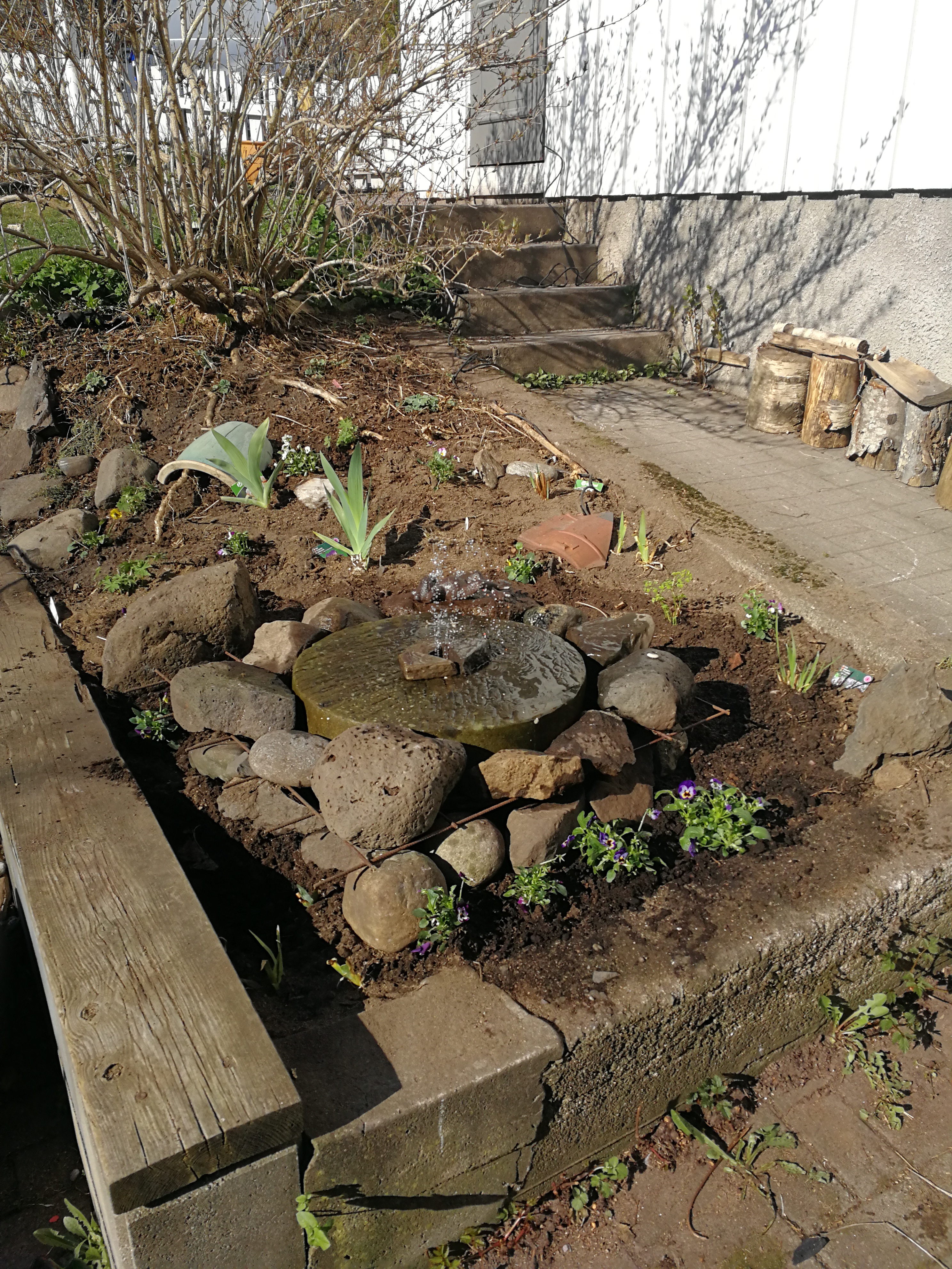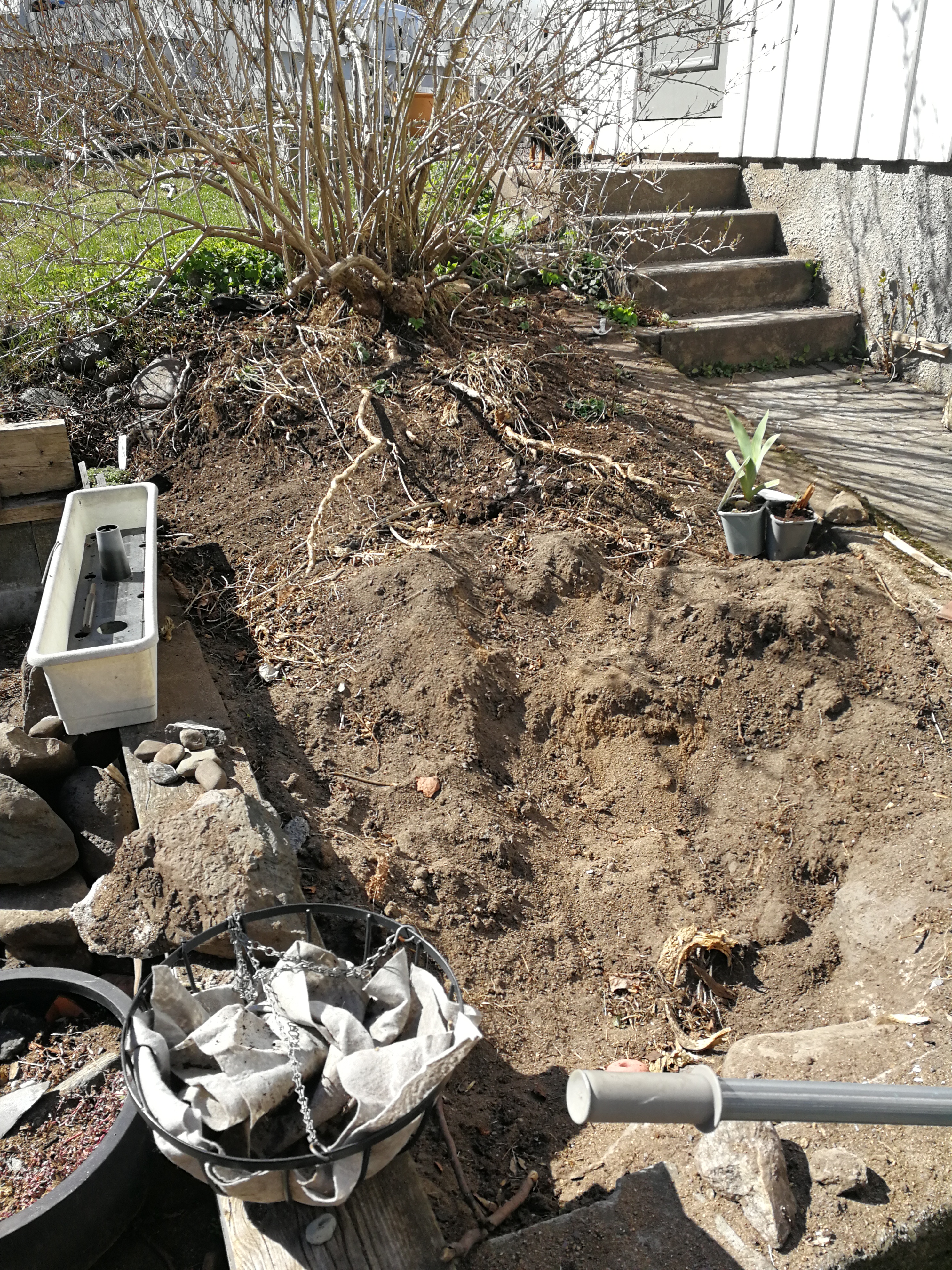 Da vi for snart 14 år siden flytta til hagen her i Horten, var det rester av et gammelt staudebed foran døra i Øvre Hage. Bedet ble raskt overtatt av krypfredløs og astilber, før det ble fullstendig dekka av gress. Siste året begynte skvallerkålen å bre seg, og det var direkte flaut å ha dette som blikkfanget når noen kom på besøk. Jeg hadde lenge snakka om muligheten for å grave opp og heller anlegge et vanninnslag i bedet, men mantraet for det meste her i hagen er inspirert ev Piet Hein: Ting Tar Tid. Så nå i påska tok jeg spaden i egen hånd og begynte å gyve løs på oppgaven.