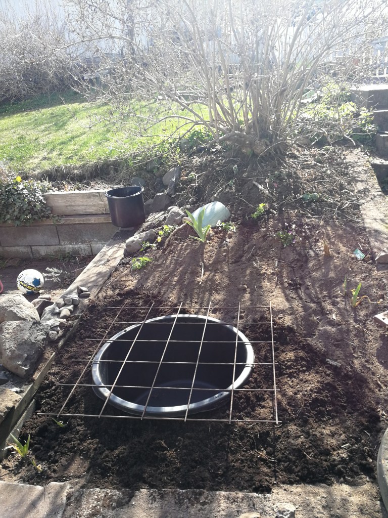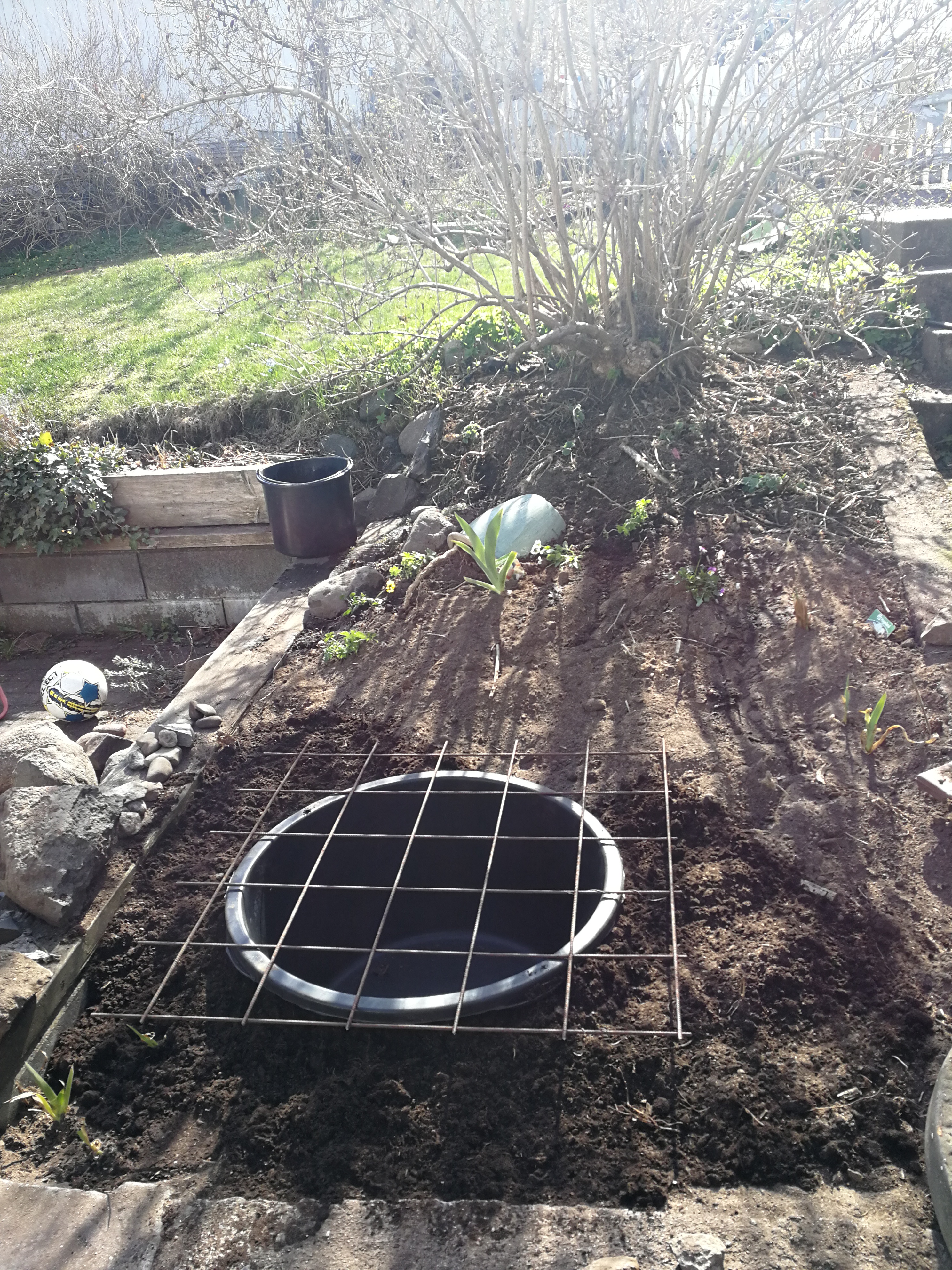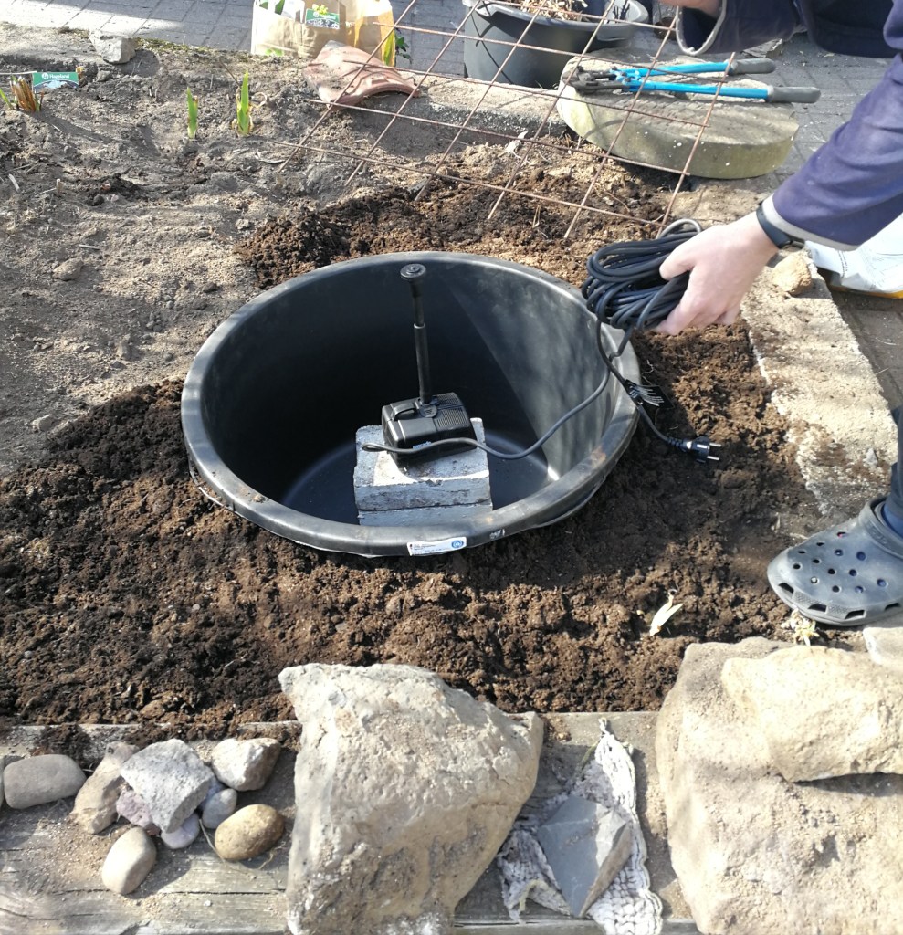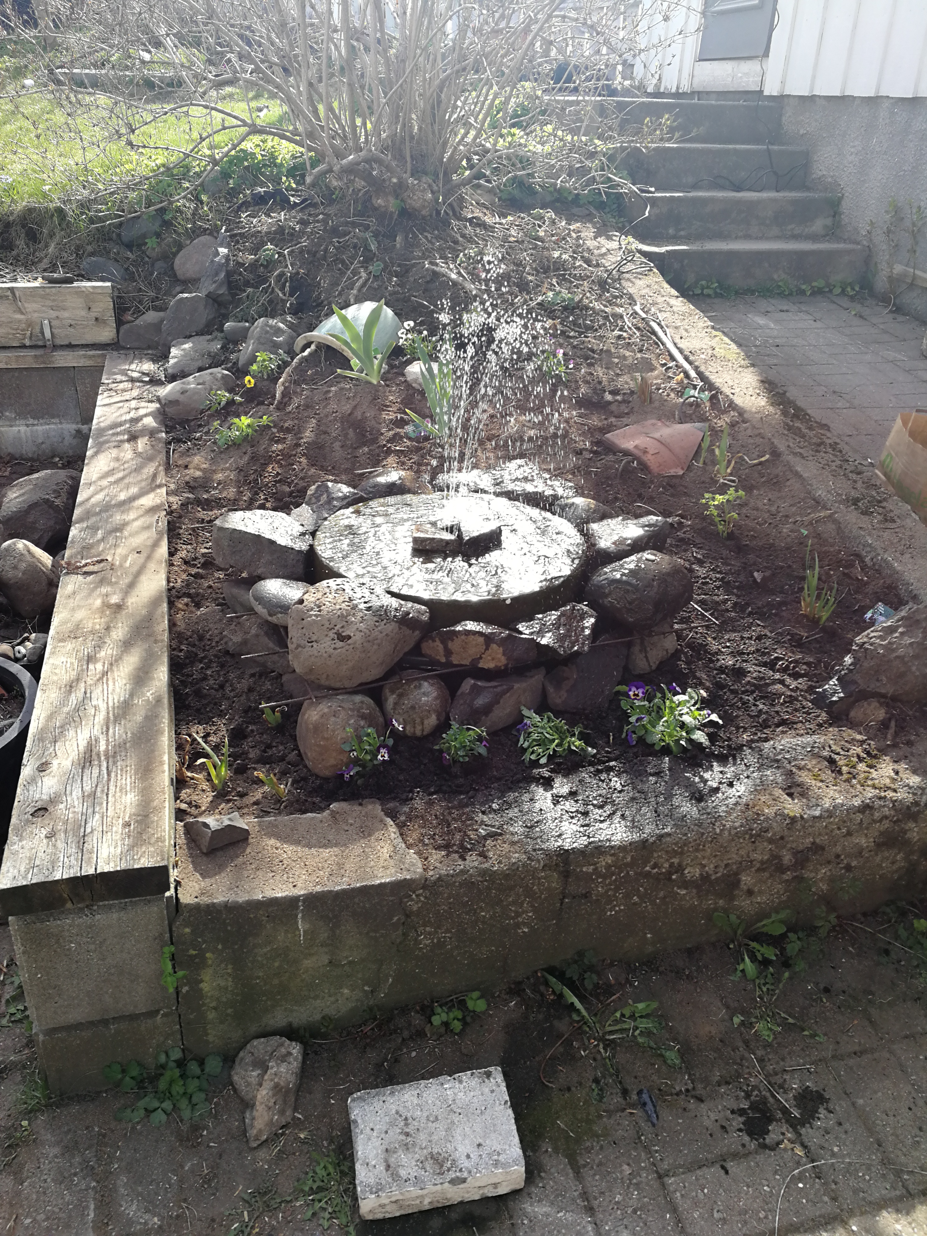 Så langt, så godt, men der stoppa det en god stund. Med alle butikker stengt (som jeg er lei av korona!) var det ikke så lett å få tak i vannbeholderen som skulle under slipesteinen jeg ville ha. Tidligere denne uka fikk jeg tak i ei stor mørtelbøtte hos Maxbo. Den rommer 90 liter og er super for formålet. Jeg fylte litt grus nederst i bedet der den skulle være, og så satte jeg bøtta oppå. Jeg fikk den i vater, og med litt hjelp i går, kom vi i mål. Vi fylte på med jord rundt bøtta, sånn at den stod støtt. Deretter satte vi noen steiner i bøtta, sånn at vannpumpa ble høy nok til å kunne komme opp gjennom hullet i slipesteinen. Så la vi armeringsjern oppå bøtta, før vi la slipesteinen oppå denne igjen. Vi la steiner både under og oppå armeringsjernet, sånn at det ble mest muslig dekket. Siden bøtta må tømmes på høsten samt pumpa må overvintres frostfritt, gjelder det å ikke dekke altfor mye oppå bøtta.