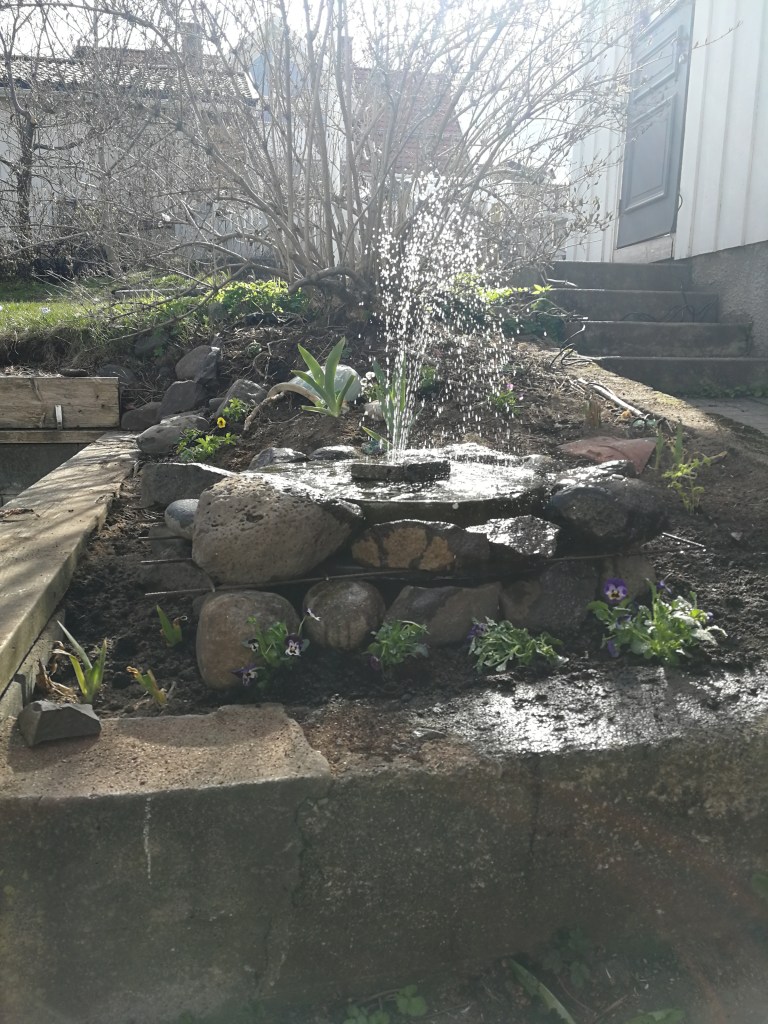 Bøtta ble fylt med vann, ledningen ble satt i kontakten, og det var bare å glede seg over fontenen som nå spruter opp over den gamle slipesteinen, før det renner ned igjen i beholderen under og sånn sett hele tiden brukes på nytt.