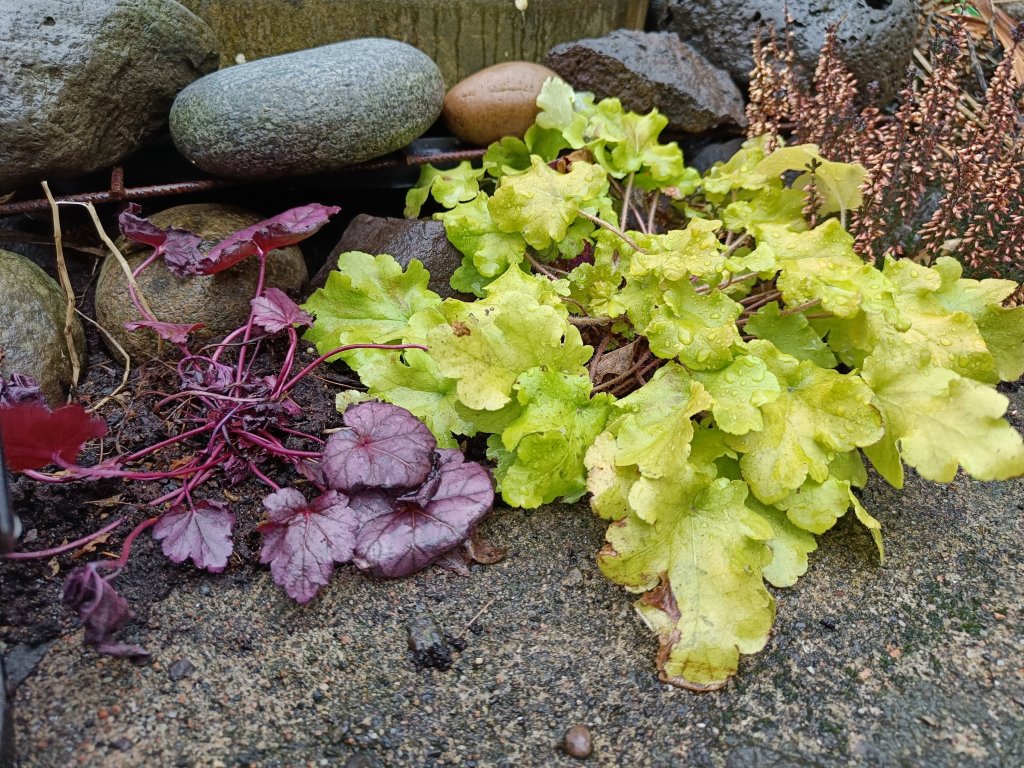 Noen av plantene som har holdt stand gjennom hele vinteren, er de fantastiske alunrotplantene jeg kjøpte i høst. De har så flotte farger på bladene! Jeg har noen flere i hagen, men så langt ser det ut til at de i Øvre Hage liker seg best. Kanskje jeg får flytte de andre opp hit også.