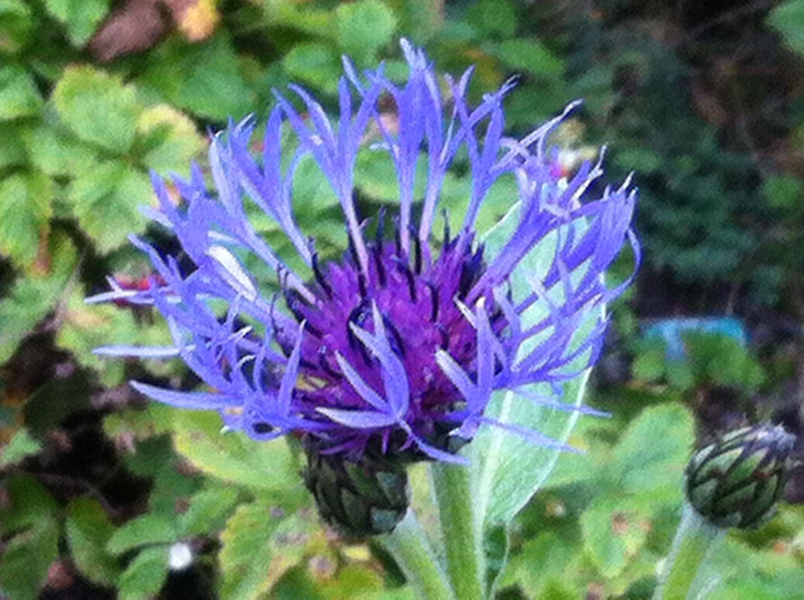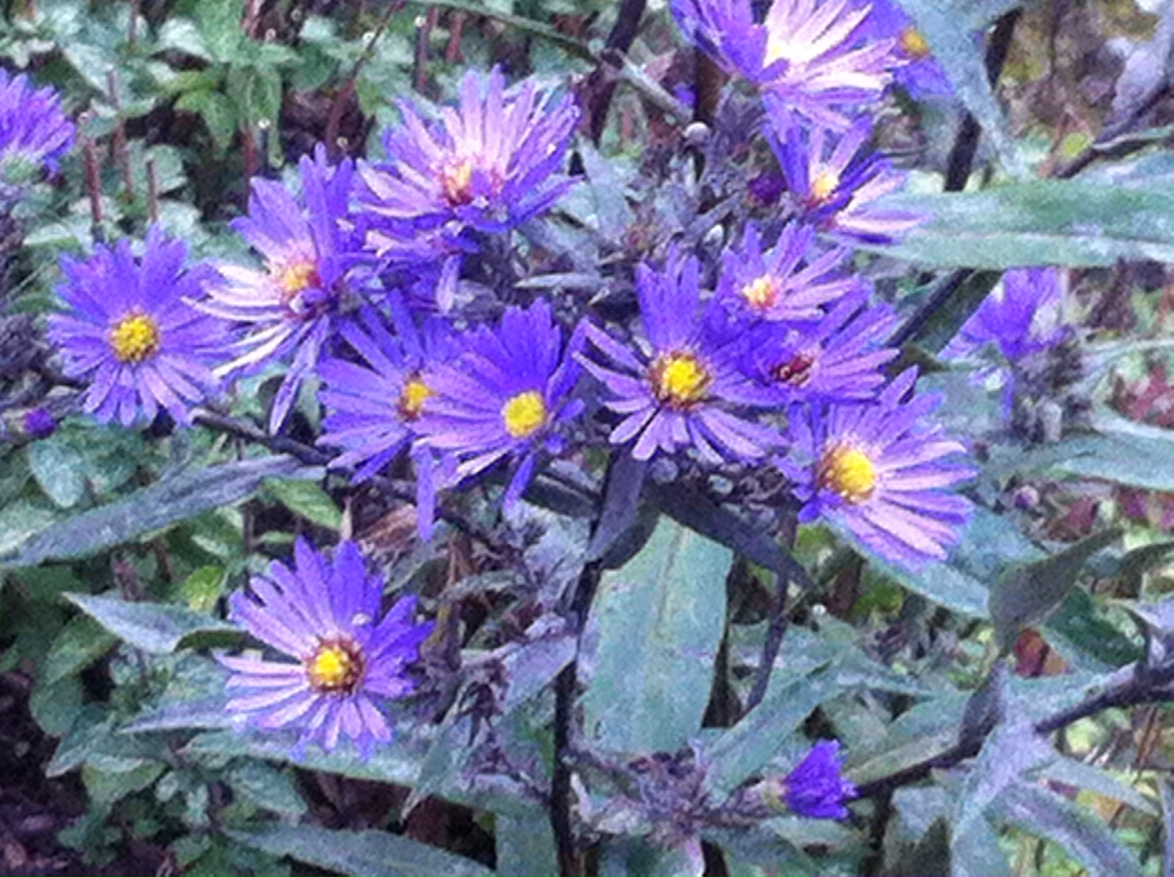 I det Blå bedet er det astersen (Astereae) jeg fikk av en god nabo for et par sesonger siden, som nå kommer til sin rett. Hva slags sort det er, vet jeg ikke, men det er av den fine sorten! Den har en vakker blåfarge, og jeg fryder meg over at den liker seg der jeg har planta den. Tidligere høstasters har ikke villet blomstre hos meg, men denne gjør som jeg ønsker. Neste sesong skal jeg gi den støtte tidlig i sesongen, slik at ikke greinene blir liggende langsmed bakken; som så mange av oss liker den tydeligvis ikke så godt et liv i oppoverbakke uten støttende venner.